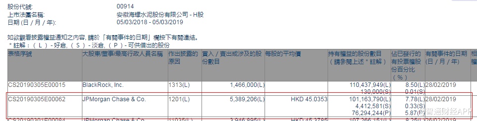 智通财经APP获悉,根据联交所资料显示,摩根大通于2月28日减持海螺水泥(00914)538万股,每股作价45.0353港元,总值2.42亿港元,最新持股数减至1.01亿股,最新持股比例减至7.78%。