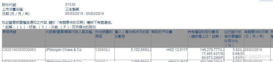 智通财经APP获悉,根据联交所资料显示,摩根大通于2月28日减持三生制药(01530)510万股,每股作价12.9117港元,总值6588.41万港元,最新持股数减至1.48亿股,最新持股比例减至5.82%。