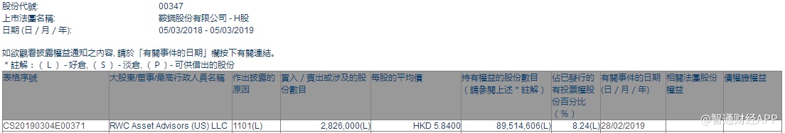 智通财经APP获悉,根据联交所资料显示,RWC Asset Advisors (US) LLC于2月28日增持鞍钢股份(00347)282万股,每股作价5.84港元,总值约1646.88万港元,最新持股数增至8,951万股,最新持股比例增至8.24%。