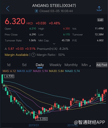 截至今日收盘,鞍钢股份(00347)升0.48%,报6.32港元。