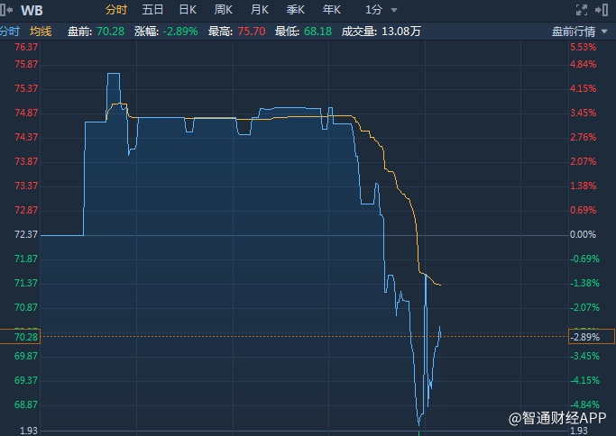 智通财经APP获悉,新浪微博 (WB.US)四季度财报公布后,该股股价盘前最大振幅近10%,上涨约4%后又下跌逾5%。 截至发稿时间9:11PM,新浪微博盘前跌3.51%,报69.80美元。