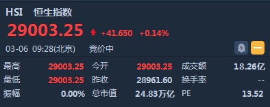 智通财经APP获悉,恒生指数开盘涨0.14%,报29003.25点。国企指数跌0.06%,报11575.78点。红筹指数跌0.11%,报4541.07点。大市盘前成交18.26亿港元。政府工作报告提出深化增值税改革。美国经济数据向好,港股ADR涨逾百点。