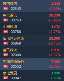 智通财经APP获悉,5G概念股今日整体上涨,截至10时41分,京信通信(02342)涨5.69%,报价2.23港元,中兴通讯(00763)涨3.96%,中国铁塔(00788)涨2.75%,长飞光纤(06869)涨1.42%。