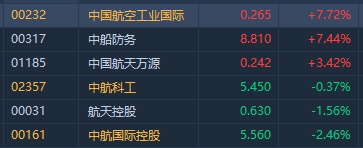 智通财经APP获悉,A股军工板块今日表现活跃,板块内涨停个股达八只,港股军工股亦跟随上涨,截至发稿中国航空工业国际(00232)涨7.72%,中船防务(00317)涨7.44%,中国航天万源(01185)涨3.42%。