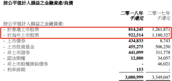 智通财经APP了解到,该公司计入损益的金融资产中,股票资产占比还是非常大的。2018年该公司与香港上市股票及海外上市股票合计计入金融资产17.365亿港元,占比计入的金融资产56.4%,这个比例在2017年达73%,下降的原因主要还2018年行情不好,持有股票的资产下降了。