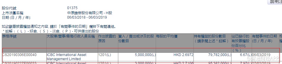 智通财经APP获悉,根据联交所资料显示,工银国际资产管理于3月6日减持中州证券(01375)500万股,每股作价2.6972港元,总值1348.6万港元,最新持股数减至7978万股,最新持股比例减至6.67%。