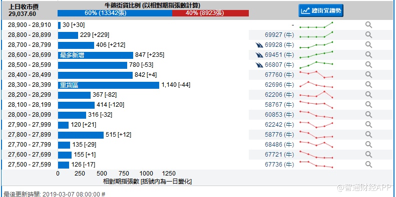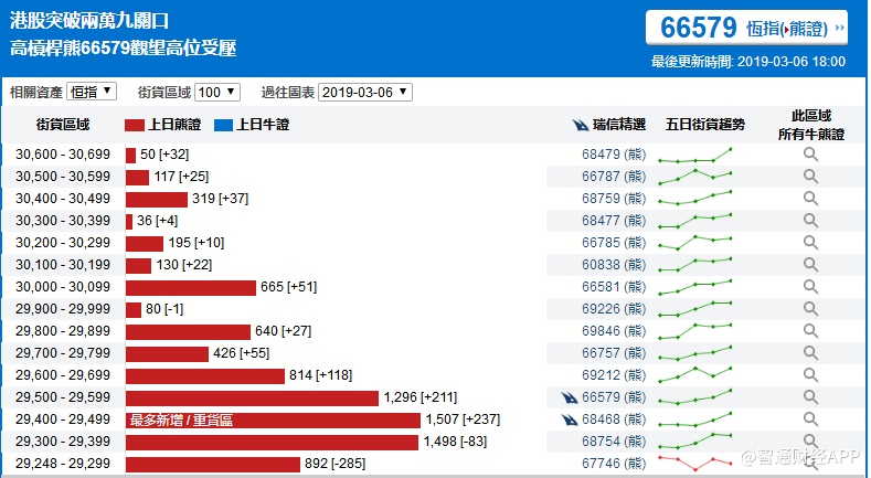 智通财经APP获悉,截至3月7日,恒指最新的牛熊街货比例60:40。从瑞信恒指牛熊证街货分布图中得到的数据显示,熊证街货重货区在29400-29499区间,该区间最新熊证数量为1507张,较上一交易日增加237张;最多新增区间也在该区间。牛证街货重货区在28300-28399区间,该区间最新牛证数量为1140张,比上一交易日减少44张;最多新增在28600-28699区间。