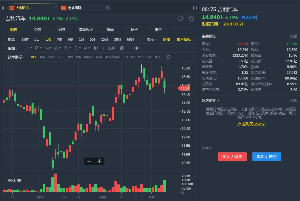 截至发稿,吉利汽车报14.84港元,跌6.19%。