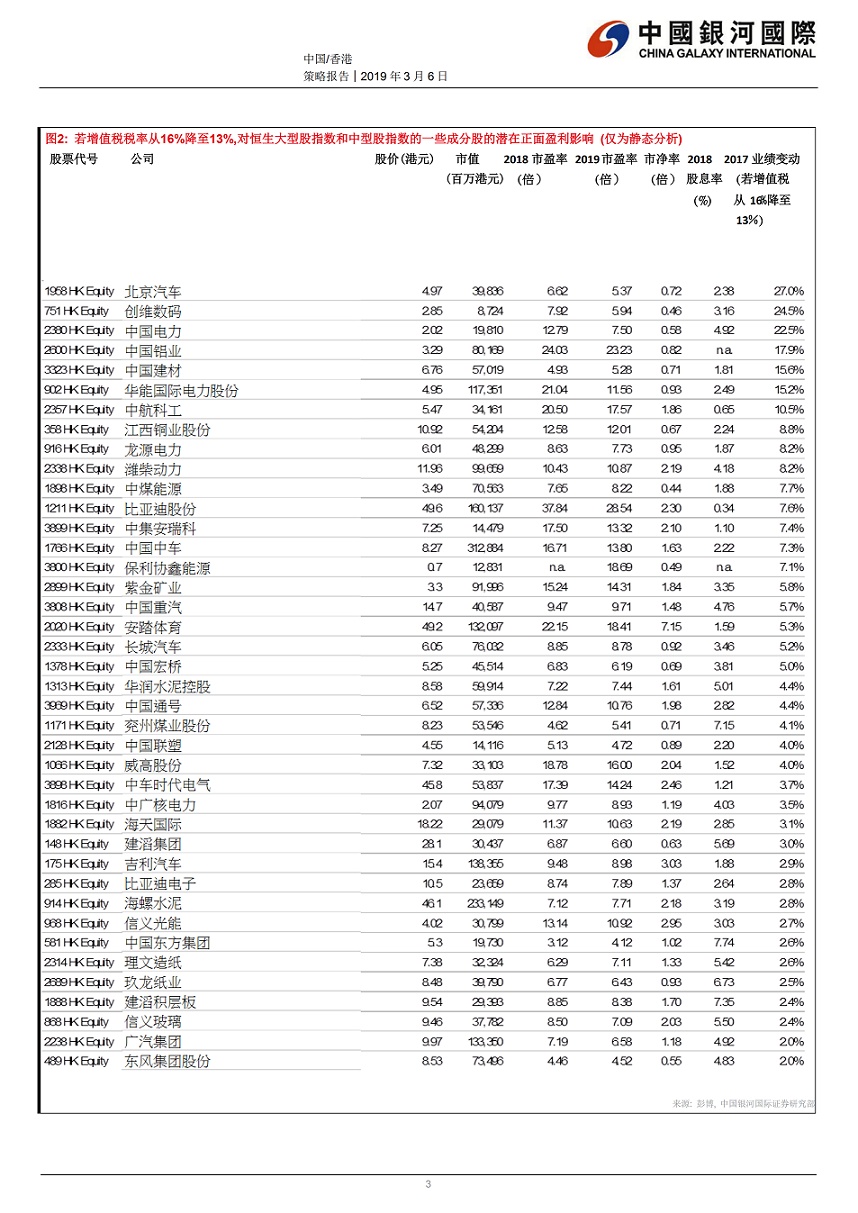 由于运输和建筑业的增值税税率将仅从10%降至9%,我们估计对盈利的潜在正面影响将为低个位数。因此,我们将分析重点放在增值税税率从16%降至13%的行业。在图2中,我们展示了税率变动对恒生大型股指数和中型股指数部分股票的潜在盈利影响。基于静态分析(假设售价和购买成本(含增值税)不变),主要的潜在受益者是电力、金属和采矿以及汽车行业的股份。但是,投资者应谨慎看待这些数字,因为实际收益在很大程度上取决于公司的定价能力。例如,如果国家电网在增值税下调后降低上网电价(含增值税),那么对发电企业盈利的潜在正面影响将较低。这在某程度上解释了为何昨天整体股价表现相对平淡。
