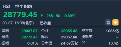 智通财经APP获悉,恒指早盘低开0.25%失守两万九,全天维持弱势,震荡走低,跌破五日线,结束四连阳。截至收盘,恒生指数跌258.15点或0.89%,报28779.45点,全日成交额达1083.5亿。国企指数跌1.14%,报11460.08点,红筹指数DIE 1.05%,报4505.77点。
