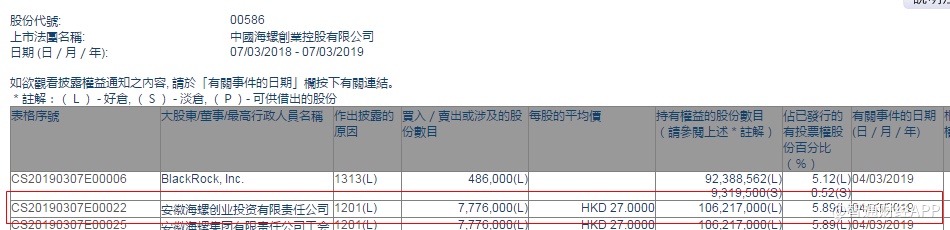 智通财经APP获悉,根据联交所资料显示,安徽海螺创业投资有限责任公司于3月4日减持海螺创业(00586)777万股,每股作价27港元,总值2.09亿港元,最新持股数减至1.06亿股,最新持股比例减至5.89%。