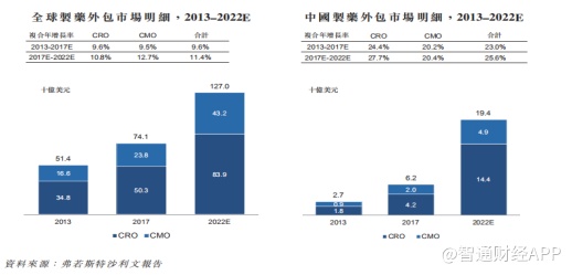 弗若斯特沙利文报告显示,开发及制造药物的过程通常需要耗费大量时间及资金,制造外包服务可以为希望在药物开发项目中实现效率的生物科技及生物制药公司带来若干优势。 全球制药外包市场的规模由2013年的514亿美元增至2017年的741亿美元,至2022年预期将增加至1270亿美元,2017年至2022年的复合年增长率为11.4%。
