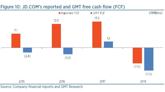 显然,我们对营业现金流的修正估计,也反映出京东自由现金流流动的一个截然不同的图景。