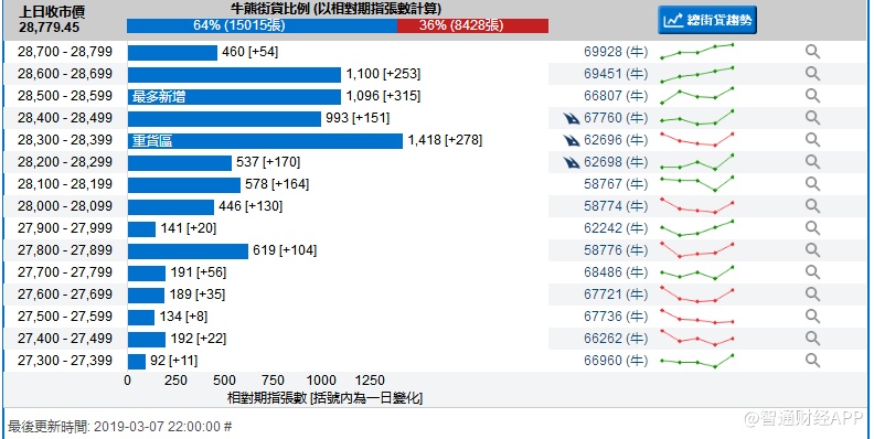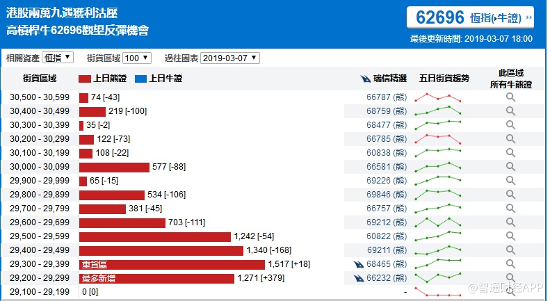 智通财经APP获悉,截至3月7日,恒指最新的牛熊街货比例64:36。从瑞信恒指牛熊证街货分布图中得到的数据显示,熊证街货重货区在29300-29399区间,该区间最新熊证数量为1517张,较上一交易日增加18张;最多新增区间在29200-29299区间。牛证街货重货区在28300-28399区间,该区间最新牛证数量为1418张,比上一交易日增加278张;最多新增在28500-28599区间。