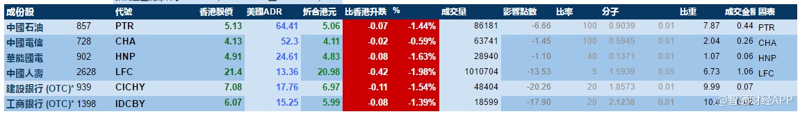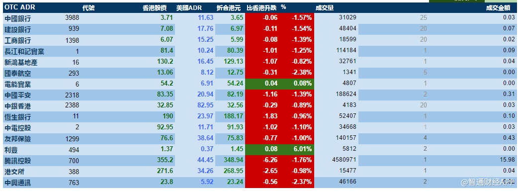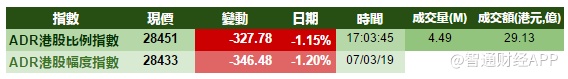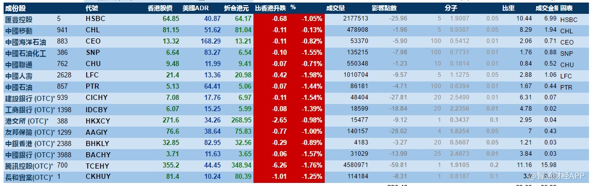 智通财经APP获悉,周四港股ADR指数跟随美股全日走软,按比例计算,收报28454点,跌325点。大型蓝筹集体下跌,汇丰控股收报64.17元,较港收市跌0.68元;腾讯控股收报348.97元,较港收市跌6.23元。