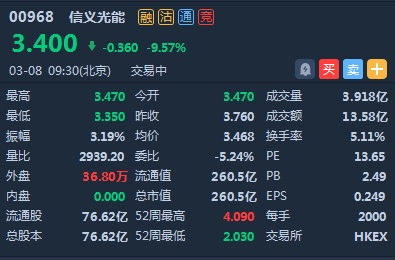 智通财经APP获悉,信义光能(00968)向控股股东先旧后新折让7.7%配股净筹逾13亿港元,股价遭重挫,截至9时30分,跌9.57%,报价3.4港元,成交额13.58亿。