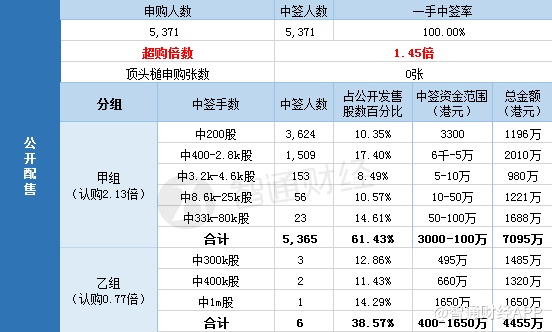 其中,公开配售申购人数5371,一手中签率100%,超购倍数1.45倍。