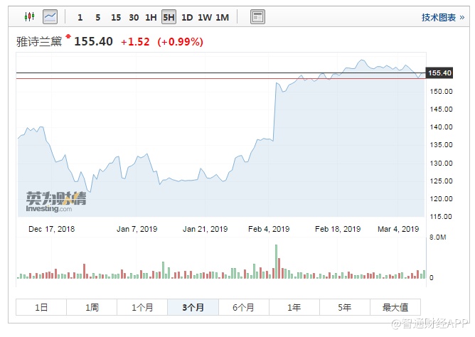 这么多支与美妆有关的股票,为什么要单独聊雅诗兰黛呢?因为这支股票最近的表现实在是太出色了!雅诗兰黛的股价在过去三个月内上涨了19.44%,超过其历史最高位,而同期纳斯达克指数只上涨了11.86%。