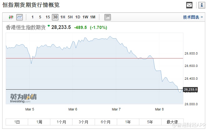 香港恒生指数期货跌489.5点或1.7%,报28233.5点。