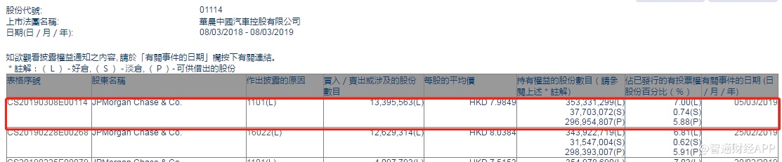 智通财经APP获悉,根据联交所资料显示,摩根大通于3月5日增持华晨中国(01114)1340万股,每股作价7.9849港元,总值约1.07亿港元,最新持股数增至3.53亿股,最新持股比例增至7.00%。