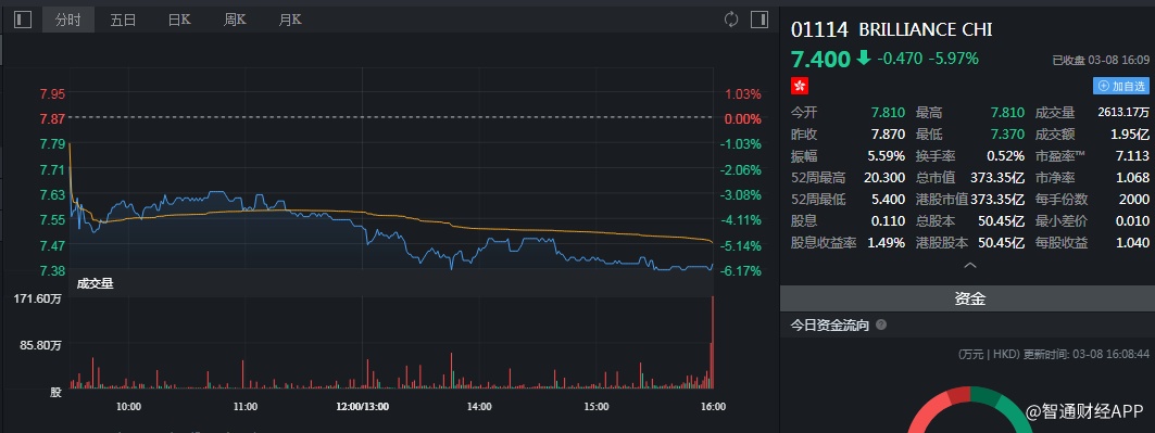 截至今日收盘,华晨中国(01114)跌5.97%,报7.40港元。