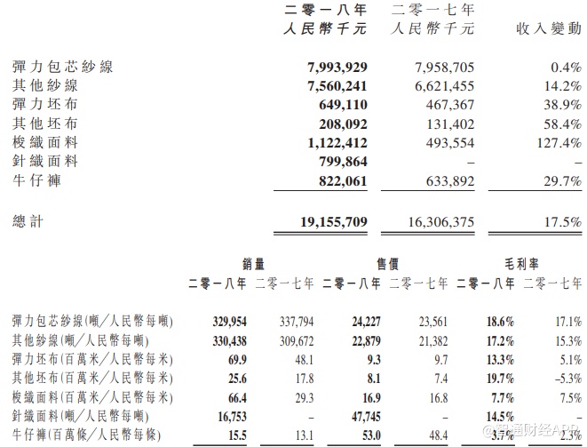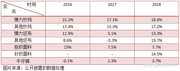 从细分的七大业务看,2018年度,该公司增长最好的业务是梭织面料,增长幅度达127.4%,针织面料是新加的业务分录,当期录得8亿元的业绩,增长最差的是弹力纱线业务收入,仅增长0.4%,其他业务均录得双位数增长。
