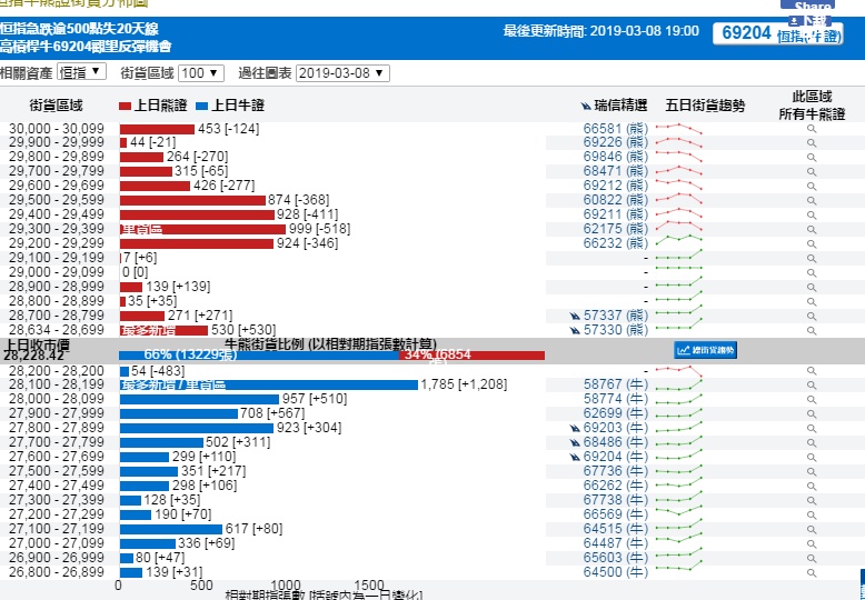 智通财经APP获悉,截至3月8日,恒指最新的牛熊街货比例66:34。从瑞信恒指牛熊证街货分布图中得到的数据显示,熊证街货重货区在29300-29399区间,该区间最新熊证数量为999张,较上一交易日减少518张;最多新增区间在28634-28699区间。牛证街货重货区在28100-28199区间,该区间最新牛证数量为1785张,比上一交易日增加1208张;最多新增也在这一区间。