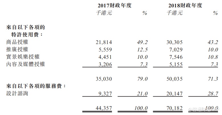 于业绩记录期间,德盈国际的业务分为五个主要业务单位,即设计咨询、商品授权、推广授权、实景娱乐授权以及内容及媒体授权,个体对收益及溢利贡献不同。下表载列于记录期间按收益类型及业务单位划分的收益分析,特许使用费分别占总收益约79%及71.3%,及服务费分别占总收益约21%及28.7%。