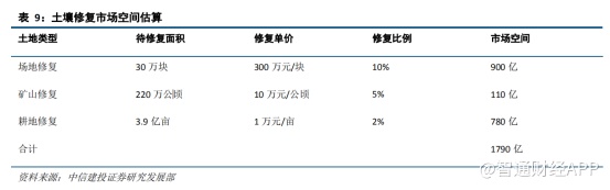 中信建投对集团未来环境修复的市场空间进行过预测,随着《土壤污染防治法》的正式出台,未来企业付费将增加,BOT 模式也将成为主流。根据测算,未来全国待修复土地包括约 30 万块场地、220 公顷矿山和 3.9亿亩耕地,将有 1790 亿的土壤修复市场空间。