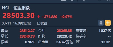 智通财经APP获悉,恒指早盘高开0.13%,之后震荡走升,全天单边上扬。截至收盘,恒生指数涨274.88点或0.97%,报28503.3点,全日成交额达1027亿。国企指数涨1.08%,报11276.91点,红筹指数涨1.15%,报4458.88点。