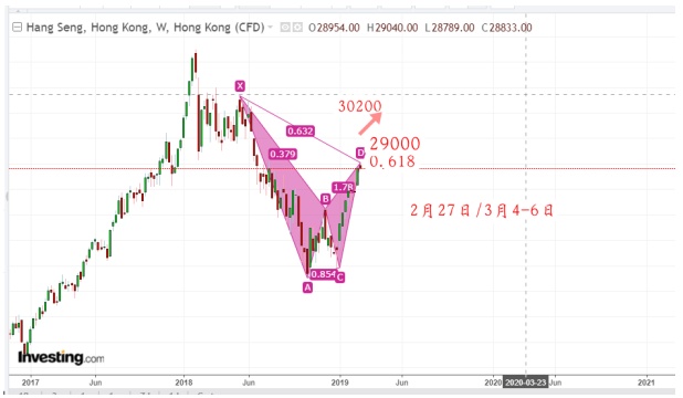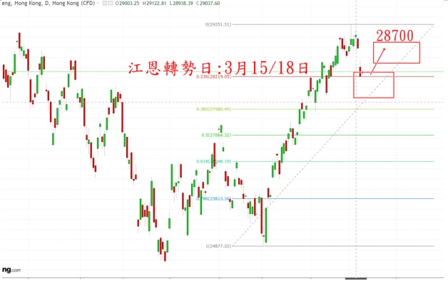 如笔者之前分析,港股有机会此次顶部在29000-30200,及关注3月4日-6日江恩转势日,结果如笔者所讲在既定日子指定价位出现回调。