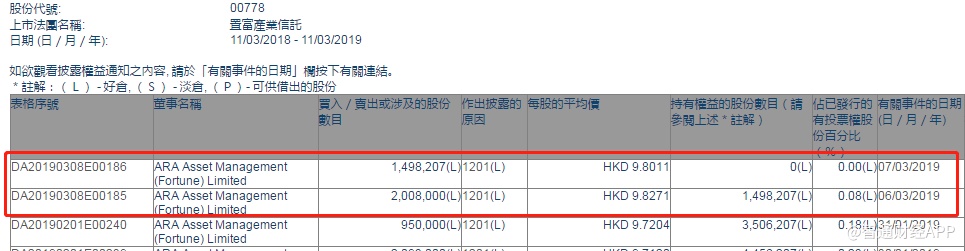 智通财经APP获悉,根据联交所资料显示,ARA Asset Management (Fortune) Ltd于3月6日及7日分别减持置富产业信托(00778)201万、150万股,每股作价分别为9.8271港元、9.8011港元,总值约3455.41万港元,最新持股数目0股。