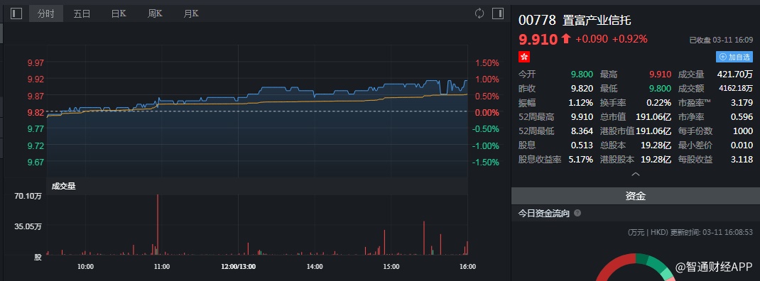 截至今日收盘,置富产业信托(00778)升0.92%,报9.91港元。