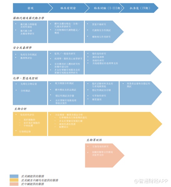 在美国,公司提供的服务包括在整个药物研发的过程中的药物代谢和药代动力学、安全性和毒理学以及化学、制造和控制。在美国及中国两地提供贯穿整个药物研发过程中的生物分析服务是最大的收入来源(分别占2016年、2017年及2018年收入的48.23%、50.58%及53.18%)。