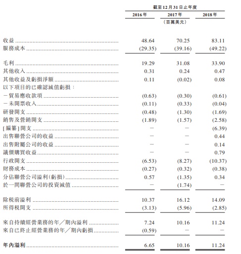 招股书显示,公司2016年、2017年及2018年的营业收入分别为4864万美元、7025万美元及8311万美元,毛利分别为1929万美元、3108万美元及3390万美元,净利分别为665万美元、1016万美元及1124万美元。