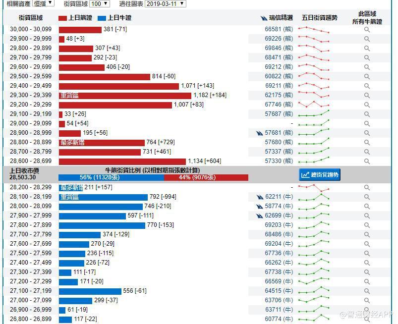 智通财经APP获悉,截至3月11日,恒指最新的牛熊街货比例56:44。从瑞信恒指牛熊证街货分布图中得到的数据显示,熊证街货重货区在29300-29399区间,该区间最新熊证数量为1182张,较上一交易日增加184张;最多新增区间在28800-28899区间。牛证街货重货区在28100-28199区间,该区间最新牛证数量为792张,比上一交易日减少9948张;最多新增也在28200-28299区间。