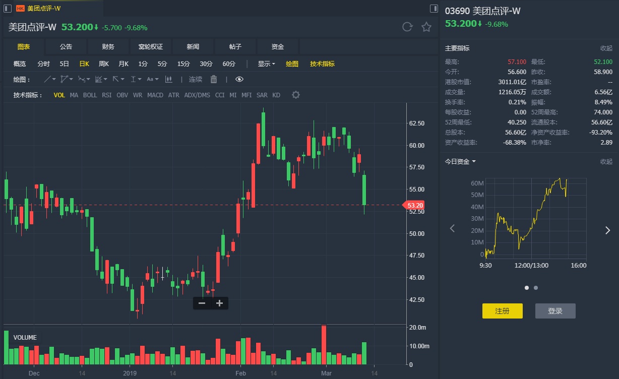 截至发稿,美团点评(03690)报53.2港元,跌9.68%。