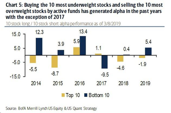 正如美国银行所补充道的那样,自2012年以来,在每个季度的头15天里,最被忽视的10只股票的年化回报比交易最拥挤的10只股票平均高出8.4%。除2017年外,在过去的5年里,通过买入主动型基金最低配的10只股票,并卖出他们最超配的10只股票,每年都能获得超额收益。