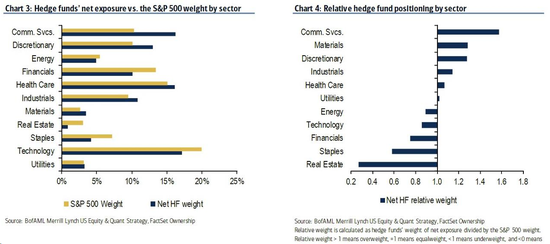 与此同时,2018年的一股趋势仍在延续,科技股在基金经理中受欢迎程度持续下降,尽管过去两个月FAANG(即Facebook、亚马逊、苹果、Netfix和谷歌母公司Alphabet)股票仓位有所增加。正如美国银行所指出的,不到一年前,在通讯服务板块爆发之前,科技股是活跃的大型基金经理中交投最拥挤的板块。该板块目前在经理人超配板块中排名第四,其相对权重目前处于1.06倍的三年低点。该板块权重下降的一个主要推动因素是软件板块,其相对权重降至2016年5月以来的最低水平1.33倍。此外,通信设备板块相对权重为0.63倍,其仓位已处于2008年美国银行编制该数据以来的纪录低位。