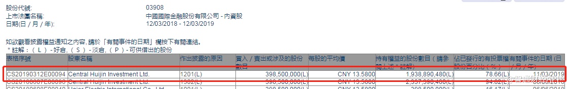 智通财经APP获悉,根据联交所资料显示,中央汇金于3月11日减持中金公司(03908)3.985亿股内资股股份(约占该公司总股本的9.5%),购买方为海尔集团公司间接控股子公司海尔集团(青岛)金融控股有限公司。每股作价为13.58元人民币,总值约54.12亿元人民币,最新持股数目19.39亿股,最新持内资股比例减至78.66%,约占该公司总股本的46.2%。