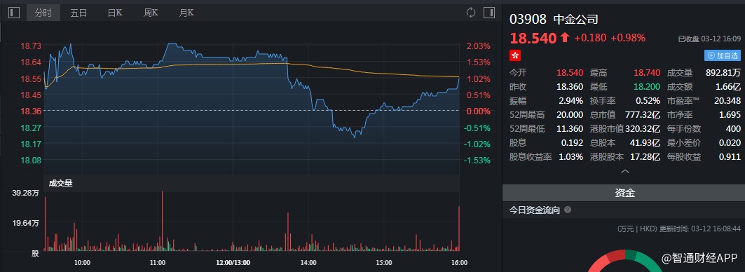 截至今日收盘,中金公司涨0.98%,报18.54港元。