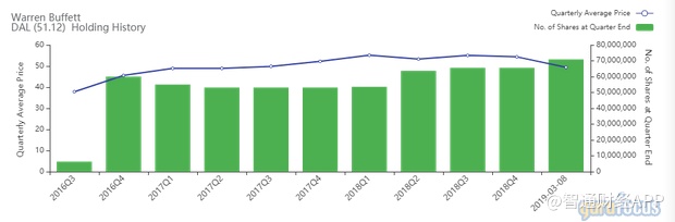 伯克希尔从2016年第三季度开始持有达美股票,当时买入平均价格为每股38美元,并在第四季度又买入大部分股票,当时平均价格为46美元。根据季度平均买入和卖出价格,GuruFocus估计伯克希尔在周一收盘时的投资收益率约为10%。