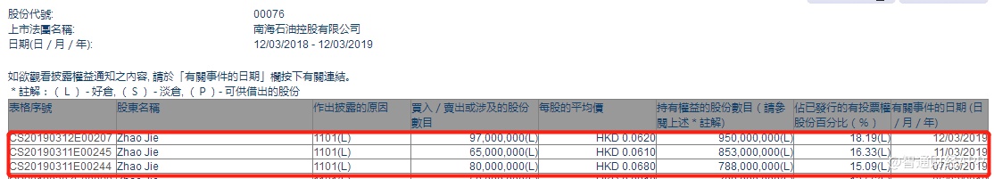 智通财经APP获悉,根据联交所资料显示,Zhao Jie于3月7日、11日及12日合共增持南海石油(00076)2.42亿股,每股作价0.062港元,总值约1500万港元,最新持股数目约9.5亿股,最新持股比例增至18.19%。