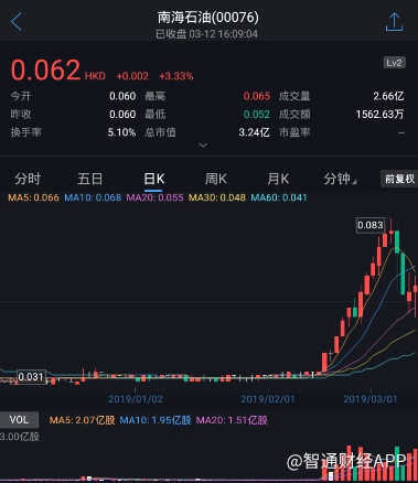截至今日收盘,南海石油(00076)涨3.33%,报0.062港元。