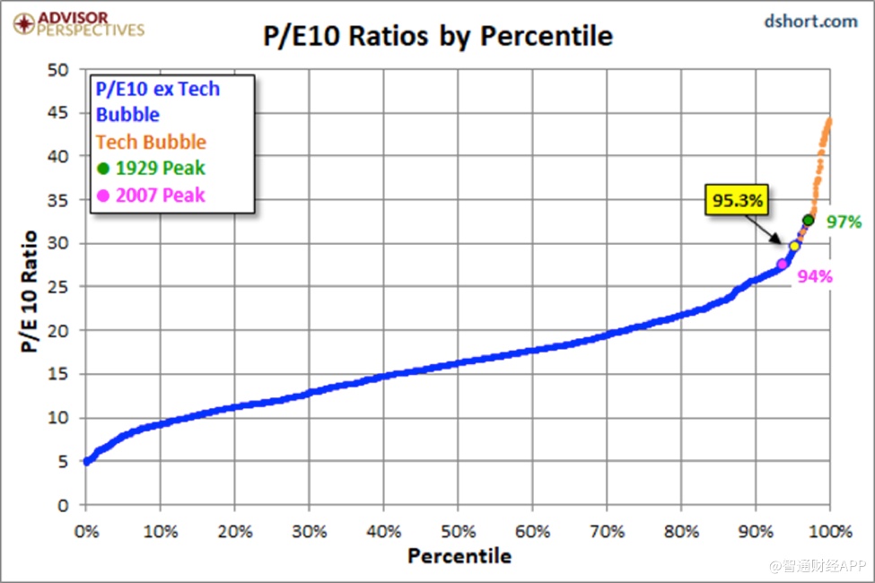 该图表标准化了自1900年以来美股的市盈率。其所使用的市盈率是基于10年的收益,并根据通货膨胀进行了修正。在图表中,市盈率的数值被指定为百分位数。较高的百分比表明股市可能被高估,而目前的读数高于95.3%。