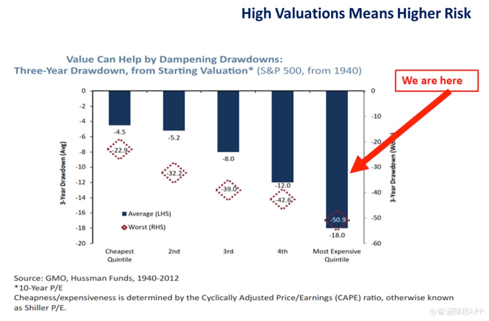 该图表显示,当股市下跌时,跌势开始时的市盈率越高,损失的规模往往会越大。风险与估值之间的关系在此图表中非常清晰、稳定。