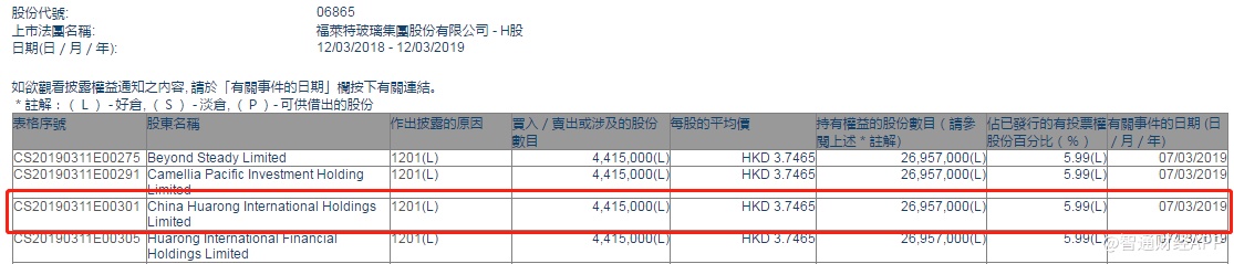 智通财经APP获悉,根据联交所资料显示,中国华融资产管理于3月7日减持福莱特玻璃(06865)442万股,每股作价为3.75港元,总值1657.5万港元,最新持股数目2695.7万股,最新持股比例减至5.99%。