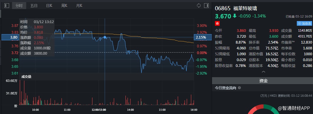 截至今日收盘,福莱特玻璃(06865)跌1.34%,报3.67港元。