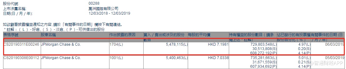 智通财经APP获悉,根据联交所资料显示,摩根大通于3月6日减持万洲国际(00288)548万股,每股作价为7.20港元,总值3945.6万港元,最新持股数目7.30亿股,最新持股比例减至4.97%。