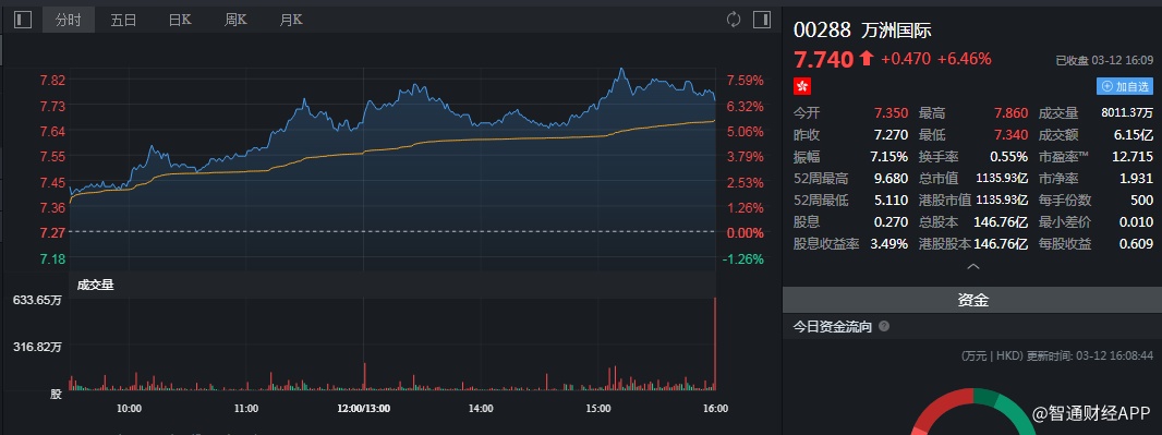 截至今日收盘,万洲国际(00288)涨6.46%,报7.74港元。